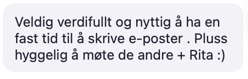 Her setter du av tid til å faktisk skrive og sende e-postene. Du logger deg på, får en kort innsjekk og jobber fokusert sammen med andre. -